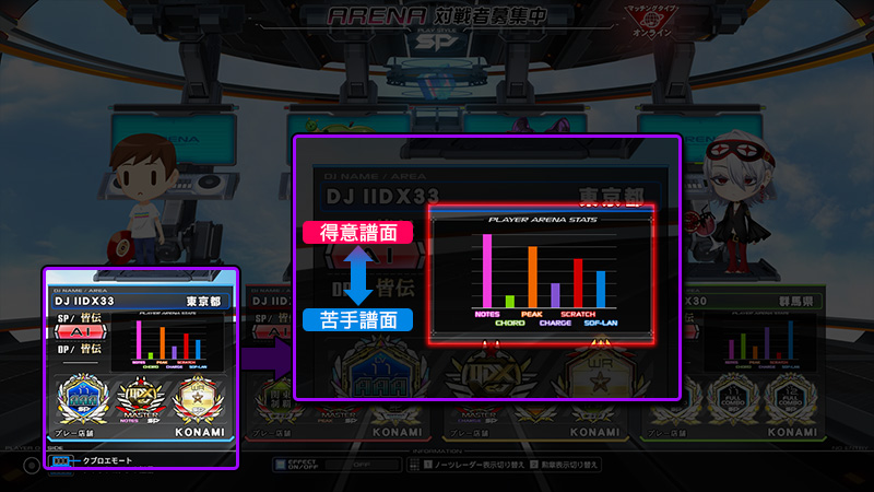 ARENAモードで実際にプレーした楽曲の順位成績を基に棒グラフで属性ごとに順位付けし、プレーヤーの得意・不得意な譜面がより分かりやすくなりました。