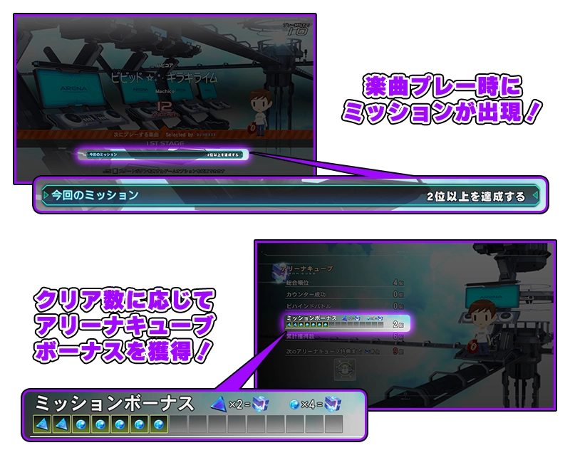 楽曲プレー時にミッションが出題され、クリアするごとに「アリーナキューブのかけら」を獲得することができます。