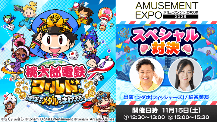 「桃太郎電鉄ワールド ~地球もメダルもまわってる!~ アミューズメントエキスポ スペシャル対決」を開催します。フィッシャーズ所属のストリーマーであり、メダルゲームが大好きなンダホさんが登場。 会場にお越しの方の中から抽選でンダホと対決するチャンス!