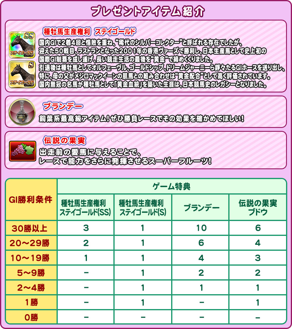 イベント期間中のGIレース勝利回数に応じて、レアな育成アイテムなどの特典を獲得することができます。