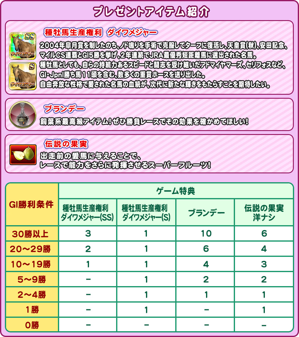 イベント期間中のGIレース勝利回数に応じて、レアな育成アイテムなどの特典を獲得することができます。
