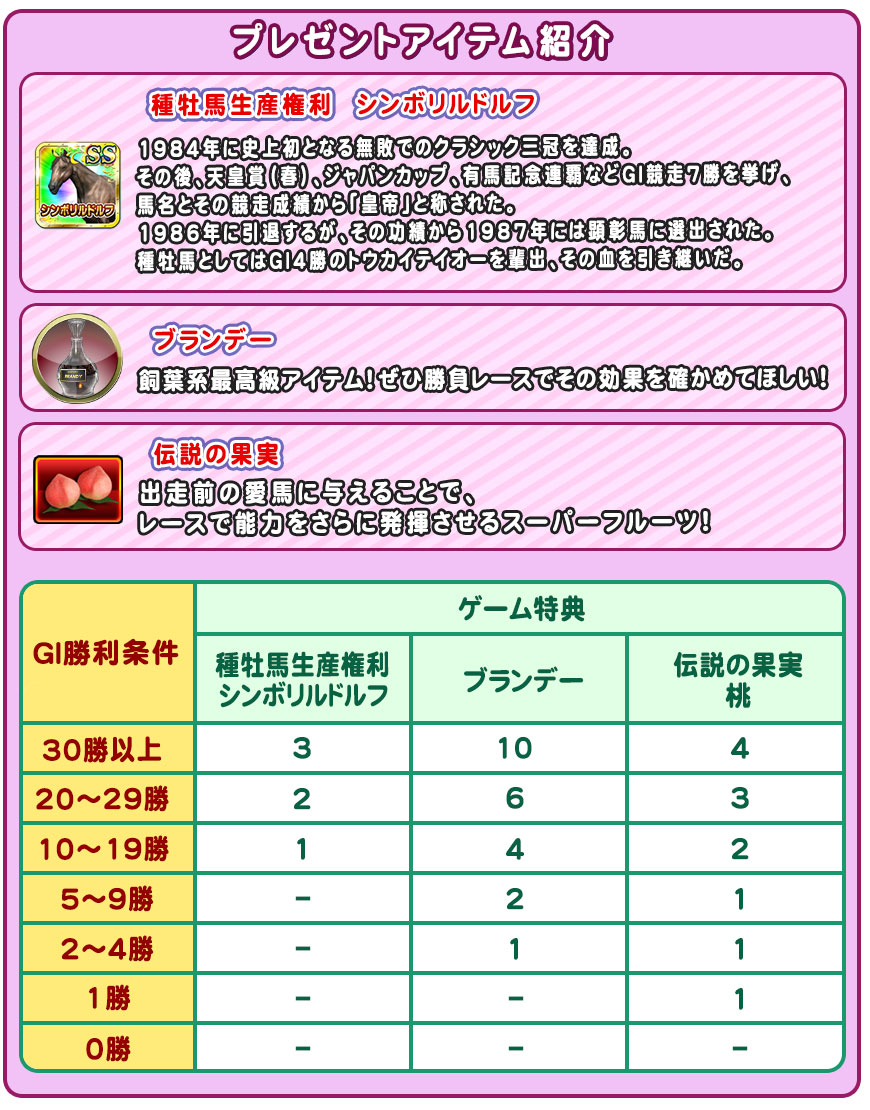 自分の競走馬を育てて、GIレースに挑戦しましょう!イベント期間中のGIレース勝利回数に応じて、レアな育成アイテム特典をゲットできます!