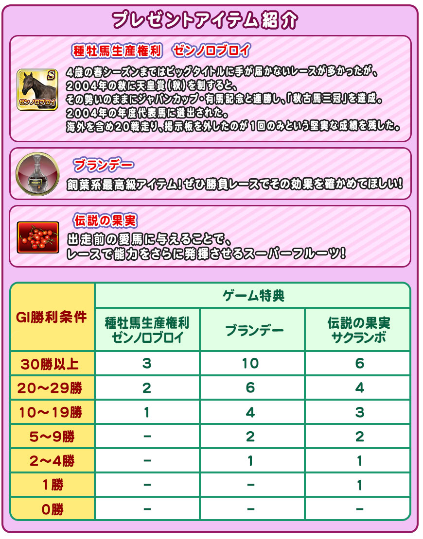 自分の競走馬を育てて、GIレースに挑戦しましょう!イベント期間中のGIレース勝利回数に応じて、レアな育成アイテム特典をゲットできます!