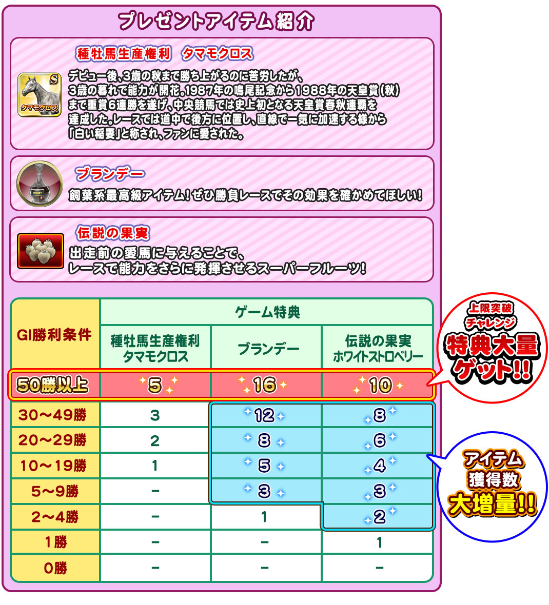 さらに、「GI2勝以上」の全てのクリア条件で、特典アイテム「ブランデー」「伝説の果実」の獲得数が増量されます!