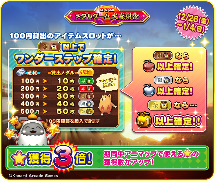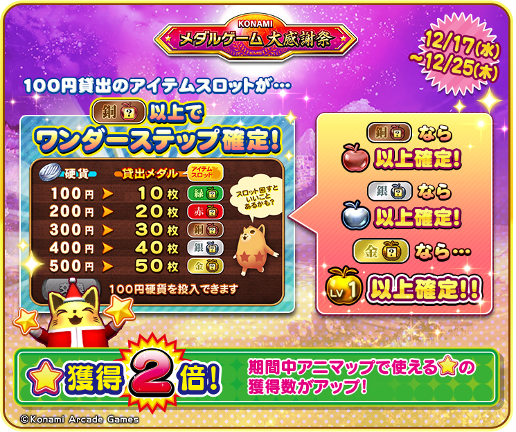 2025.12.17 ・【KONAMIメダルゲーム大感謝祭 クリスマススペシャル】12月17日~12月25日 ★獲得2倍イベント実施&100円貸出のアイテムスロットが銅スロット以上でワンダーステップ確定!