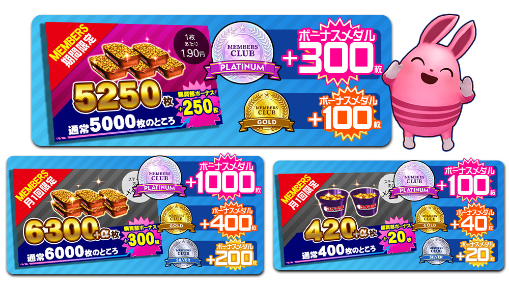 ステージを上げてコナステ メダルコーナーでMEMBERS対象アイテムを交換するとボーナスメダルが付与されます。