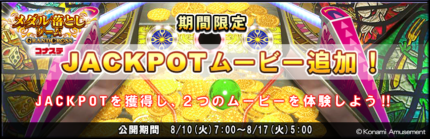 ・「メダル落としゲーム GRANDCROSS コナステ」 ⇒ 期間限定!JACKPOTムービー追加のお知らせ