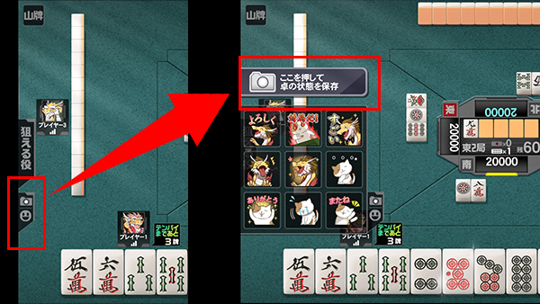 対局中に現在の卓の状態をスナップショットとして保存することができます。カメラと顔のアイコンを押すと、スナップショットを保存するボタンが表示されます。