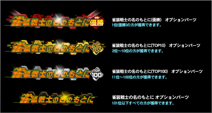 | 順位 | 雀装戦士の名のもとに オプションパーツ | 限界突破の秘伝書 | 限界突破の書 (ランダム) | 雀石 | ハート 極大 |