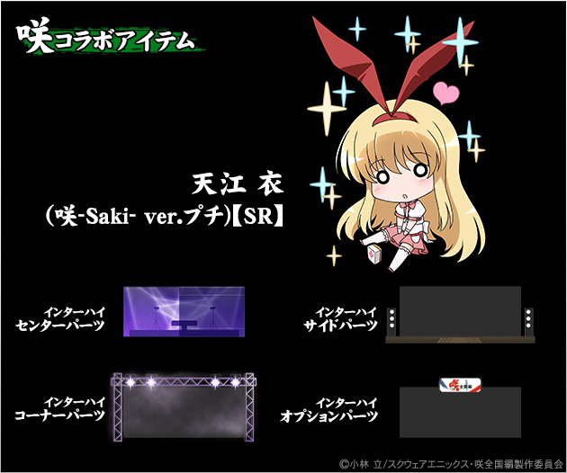 - コラボショップで入手できる「天江 衣(咲-Saki- ver.プチ)」は「天江 衣(咲-Saki-)」等と同様のボイスですが割り当て数が少ない形で適用されております。ボイス内容はコラボショップ内で事前にご確認ください。