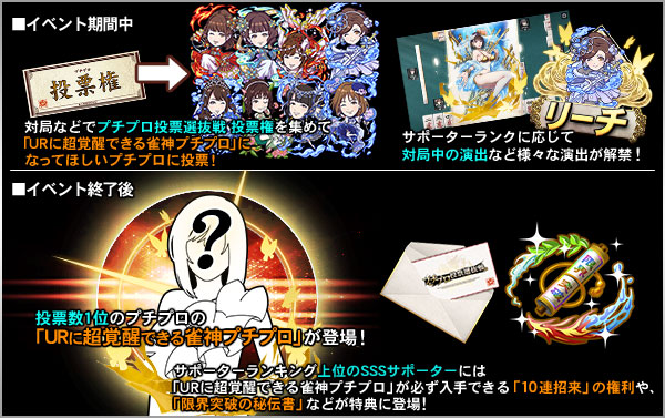 さらに、各プチプロのサポーターランキング上位のSSSサポーターは、後日登場するURに超覚醒できる新たな雀神プチプロが必ず入手できる10連招来の権利や、限界突破の秘伝書なども獲得できるので上位を目指して投票しよう!