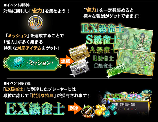 「雀力」を一定数集めてイベント仕様の卓背景・限界突破の書(岡田 紗佳)など様々な報酬をゲットし、勝利を重ねて 称号「EX級雀士」を目指そう!