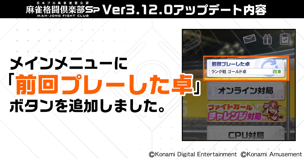 ※一部プロ雀士は見た目の変更はありません。詳細はアプリ内などをご確認ください。 - メインメニューに「前回プレーした卓」ボタンを追加しました。前回と同じ卓ですぐに対局を始められるようになります。