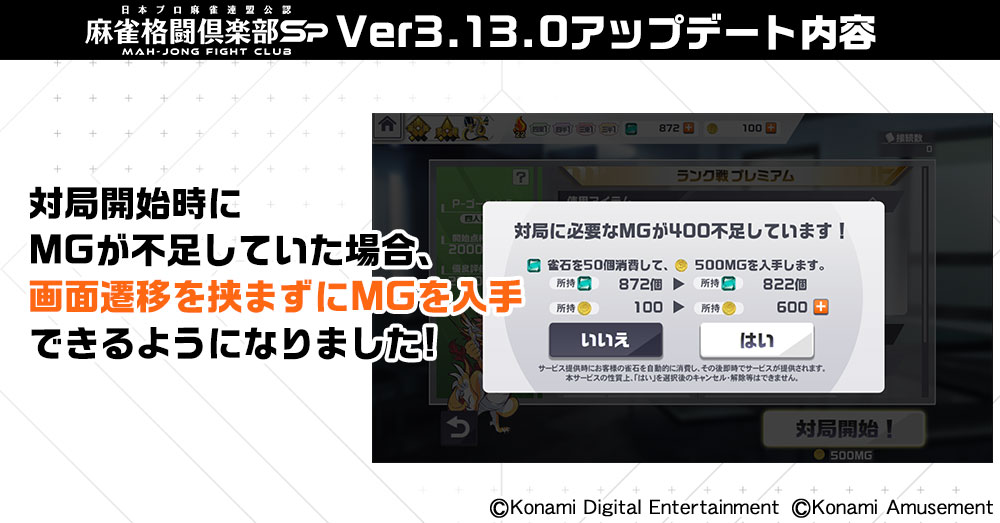 - 対局開始時にMGが不足していた場合、画面遷移を挟まずに、雀石を使ってMGを入手できるようになりました。