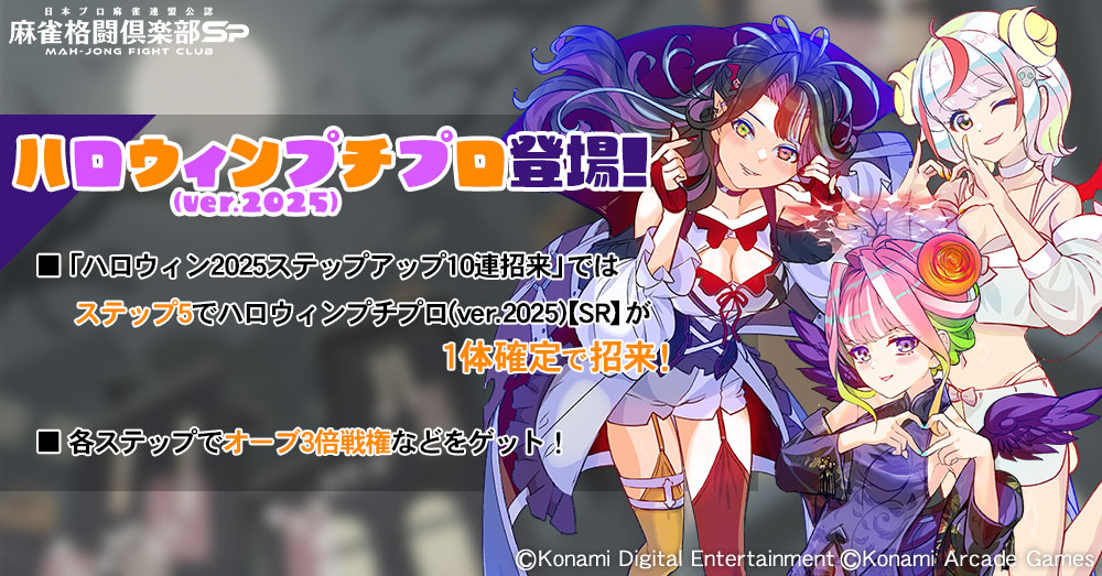 (2)招来ハロウィン2025ステップアップ10連招来「ハロウィン2025ステップアップ10連招来」を開催!ステップ5でハロウィン ver.2025プチプロの中から【SR】が1体確定!以下のプチプロが招来可能です。