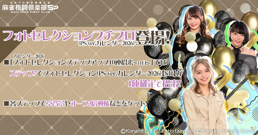 (2)招来カレンダー2026フォトセレクションステップアップ10連招来~11月~「カレンダー2026フォトセレクションステップアップ10連招来~11月~」を開催!ステップ7でフォトセレクション(PS ver.カレンダー2026)プチプロの中から【SR】が1体確定!以下のプチプロが招来可能です。