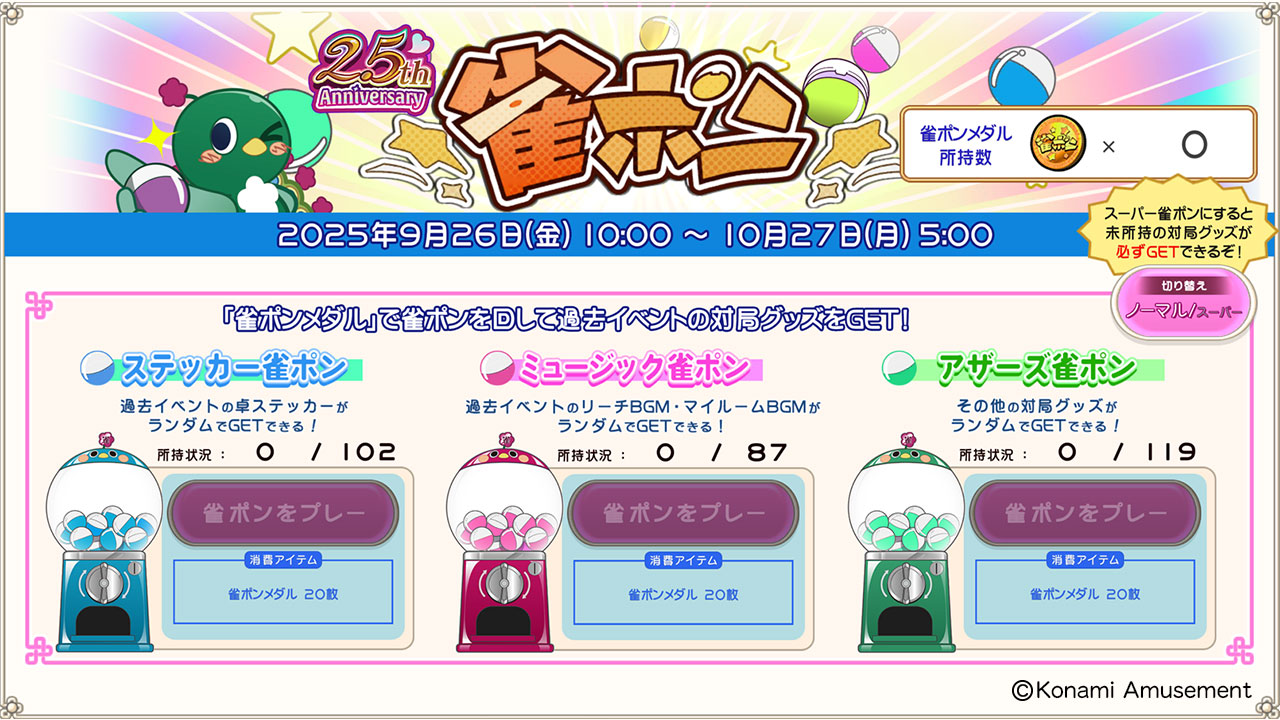 所持済みの場合は雀ポンメダル5枚に変換。スーパー雀ポン 雀ポンメダル50枚