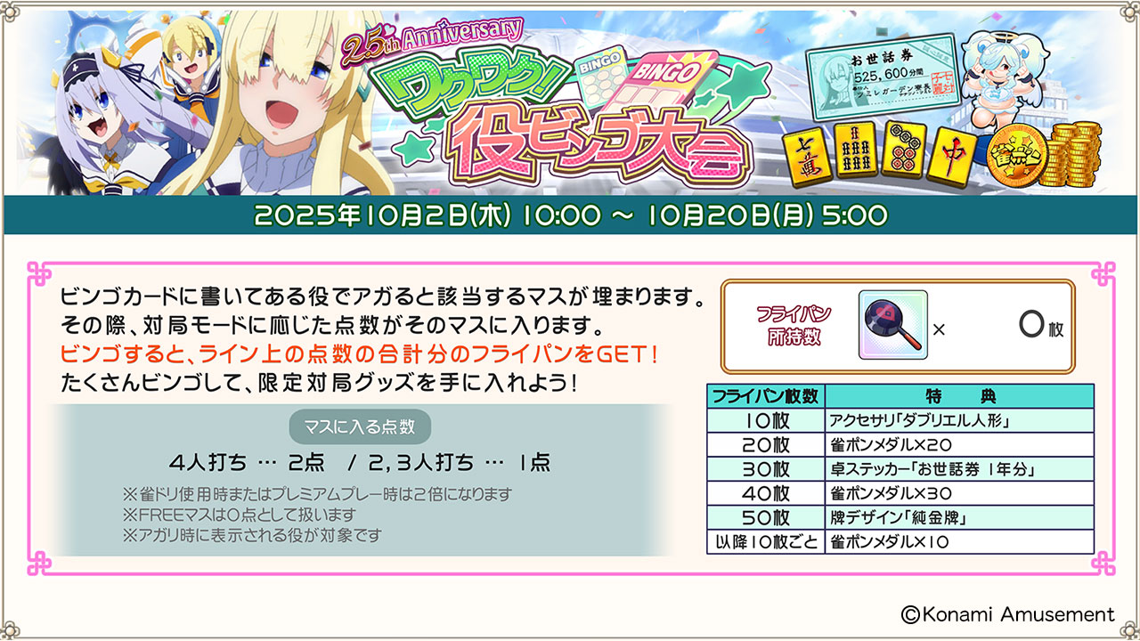 ビンゴカードに書かれた役でアガると該当するマスが埋まり、ビンゴ達成でファイトスピリットや対局グッズを獲得できるイベントです。