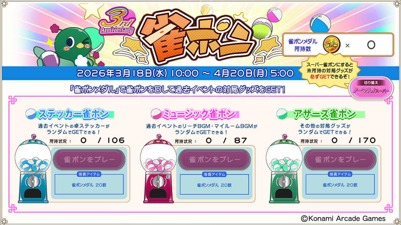 所持済みの場合は雀ポンメダル5枚に変換。スーパー雀ポン 雀ポンメダル50枚