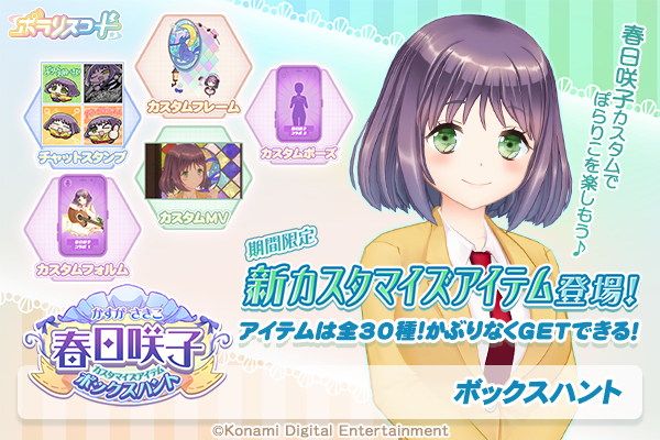 春日咲子のカスタマイズアイテムが登場!カスタマイズアイテムを使って、よりゲームを楽しもう♪ アイテム一覧はコチラ! カスタマイズアイテムはe-amusement購買部でのみハントが可能です。
