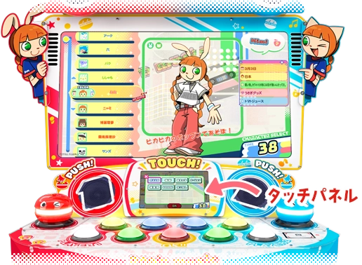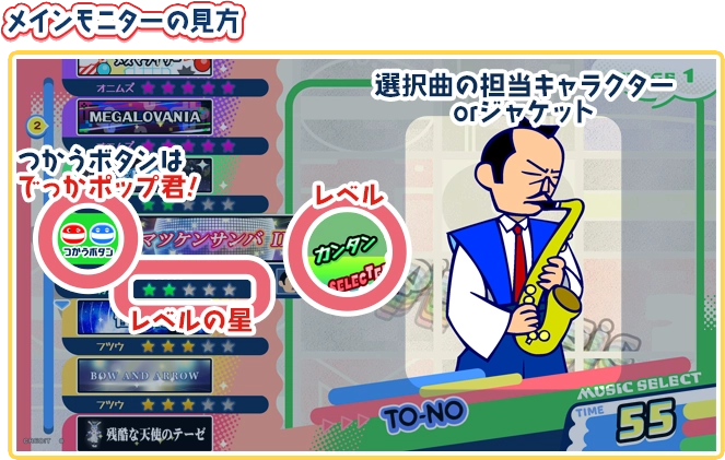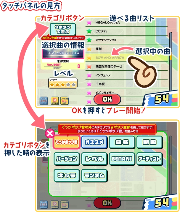 タッチパネルからプレーしたい曲を選んでね。9ボタンで遊びたいときはタッチパネルの左上の「9ボタンで遊ぶ」を押して「でっかポップ君」以外のカテゴリを選ぼう!