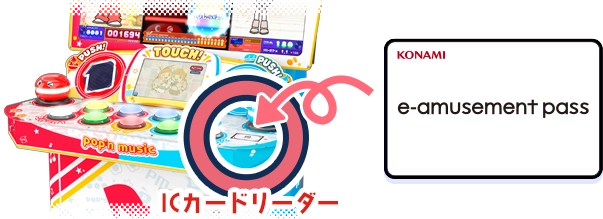 e-amusement passを使うと、プレーデータの保存や、新しい曲、キャラクターにも出会えちゃうよ♪ICカードリーダーにかざして、タッチパネルで暗証番号を入力しよう。