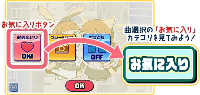 プレーした楽曲が気に入ったらタッチパネルのボタンを押してね!MUSIC SELECTの「お気に入り」カテゴリに登録されるよ♪